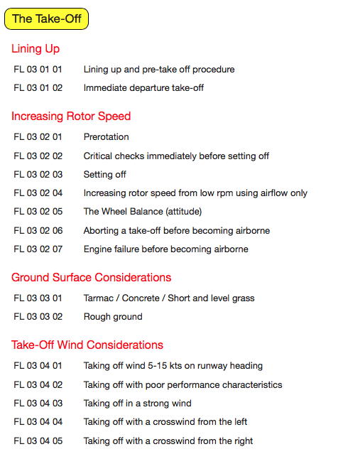 For each heading, we listed the elements and scenarios that a gyroplane pilot might encounter during their lifetime of flying. For example: