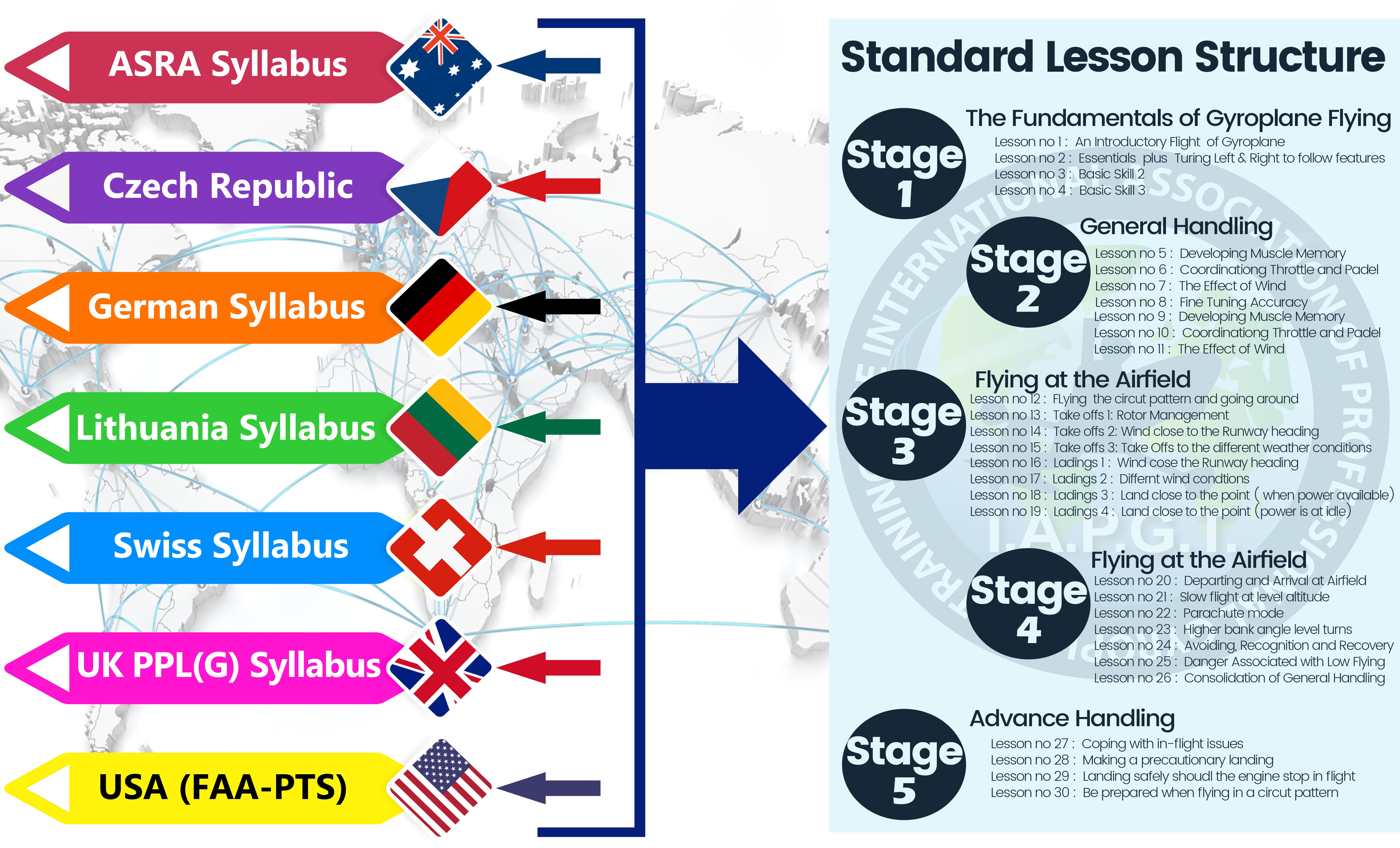 We have examined the gyroplane training syllabuses that have been created around the world, to learn from the experience of the pioneer instructors who developed them, and we have consolidated the best practice techniques from these syllabusses into a single list of lessons, applicable worldwide.